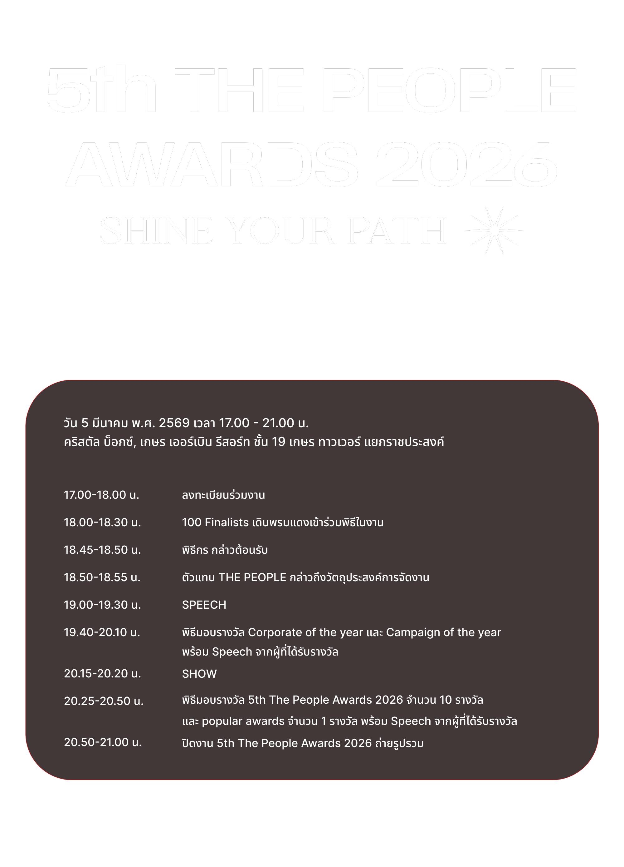 แสงแห่งแรงบันดาลใจเริ่มต้นแล้วกับ ‘5th The People Awards’ ภายใต้แนวคิด ‘Shine Your Path เปล่งประกายบนเส้นทางของตัวเอง